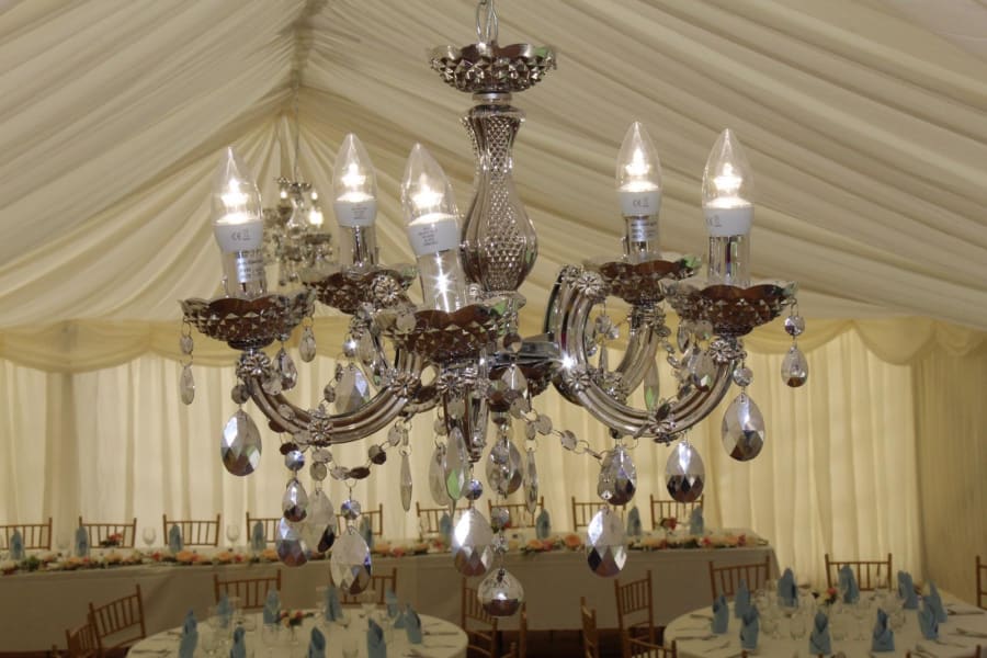 Our 12 Arm Chandeliers are the perfect finishing touch for any of our Clear Span Marquees. Designed to combine elegance with practicality, these chandeliers provide bright, reliable lighting while adding a stylish centrepiece to your event space.